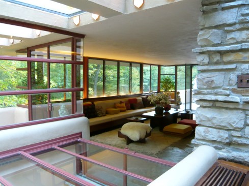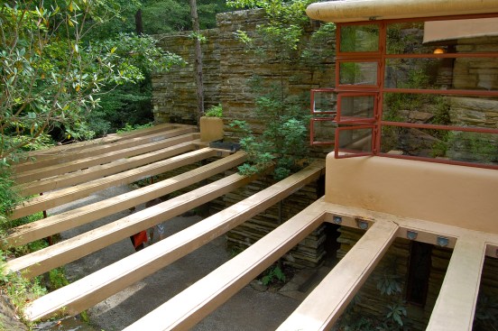 It is this particular confluence of ideas and form that make Fallingwater the most accomplished item in all of Wright’s voluminous catalog. In no other building was he able to express with greater clarity and complexity this notion of an architecture that eschews the piling up of material to create monuments, static objects, and closed-off forms in favor of the fluid weaving of space, material, form, and the life in and around the structure.