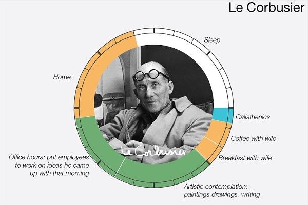 The data come from Daily Rituals, a book by Mason Currey about how geniuses divided their days. The visualization comes courtesy of Info We Trust. It’s neat—and good for Corbusier that he got to spend a quarter to a fifth of his day in artistic contemplation—but isn’t this graphic missing an important null set? The amount of time these geniuses spent making their homes or caring for their children? Not all of them had children (or homes, I suppose), but surely someone picked up after Kant and Balzac and Dickens and Milton and Tchaikovsky and Freud and (you see a pattern here?), enabling them to live the life of the mind.