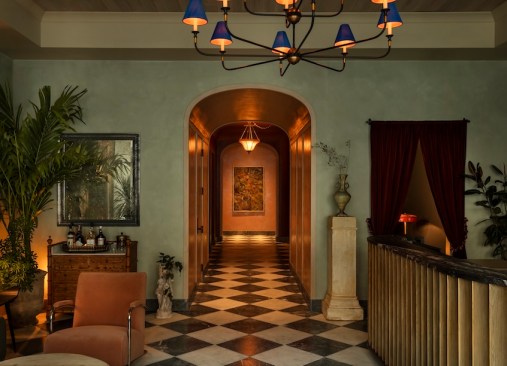 Inside, the hotel draws from Southern and European influences. The lobby, a contemporary take on a classic Charleston townhome, features hand-clipped marble mosaics, checkerboard flooring, and painted porcelain plaster walls in sage green—a historic pigmentation seen throughout the city. A vintage French tapestry anchors the space.