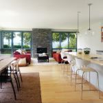 Many materials, such as the maple floor planks and island counter, and the stone fireplace surround, come from the Burlington area. The slate tiles in the entry foyer were quarried in nearby New York State; the bluestone pavers outside are native to New England. Choosing local materials mitigates the project’s environmental impact, and it also connects the home to its peaceful lakefront setting. “The color palette is taken from the lake and the sky,” Ruskey says. “The design goal was to keep the house really clean and simple, and express the natural materials.”