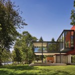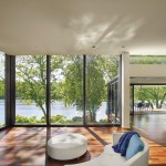 Situated on a former children’s summer camp, the property is located on the banks of the river in an area that is prone to flooding up to two feet. Faced with the challenging site, Philadelphia architect Michael Ryan designed an elevated structure–perched on stilts–to create a modern and elegant atmosphere amid the Schuylkill’s distinct outdoor scenery.
