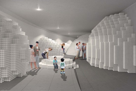 Today, the Dupont Underground announced that the winner of this design competition, dubbed “Re-Ball!“, is “Raise/Raze” by New York studio Hou de Sousa. The winning design transforms the hundreds of thousands of plastic balls into tens of thousands of blocks that visitors can rearrange inside the space. The competition entry explains the concept: “Raise/Raze is like sand in a massive sandbox, something akin to a life sized Lego set, or a real-world version of the popular video game Minecraft, which allows users to alter their surroundings with ease.” The design divides the 14,000 feet of underground space into five zones of ball-blocks: Text, Cave, Grove, Shell Valley, and Government Buildings.