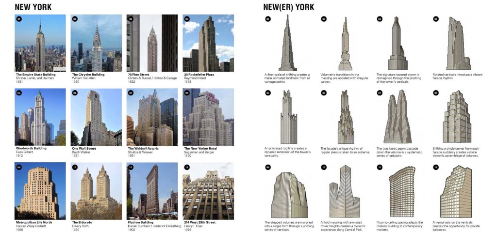 Manhattan-based firm Hollwich Kushner‘s research design project, New(er) York, imagines what Art Deco landmarks in New York City would look like if they were designed with contemporary styles and construction techniques. The project explores how a city’s built history can inform its future construction, and explores the question of whether it is a building’s inherent character that elevates it to iconic status, rather than only its aesthetics, since stylistic tastes change with time.