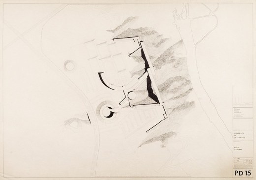 Erickson’s idea of how to extend the campus as it grew was very different and would have made that path more logical. He envisioned another wing to the university, of the same length but slightly offset, to make the line even more powerful, and then a large circle on the flat part of the site that would have contained student housing and other services. Every aspect of Lethbridge that both he and the clients expected to grow considerably would have its own geometry and form, carried out in concrete and anchored to the landscape.