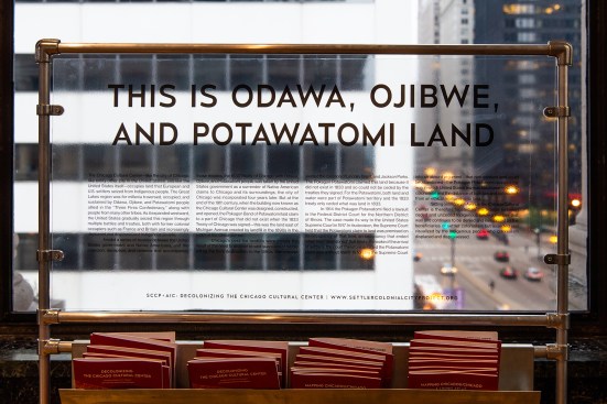 5) Settler Colonial City Project’s naming project (mounted in collaboration with the American Indian Center), whose simple texts, spread throughout the Cultural Center, evoke the Native American spaces that were previously in the city, and highlight the fact that some of the building’s material was made with exploited labor. All you get, however, are the words. Why showing photographs or paintings of what was lost, or how the land was appropriated, would somehow have detracted from that message, I do not know.