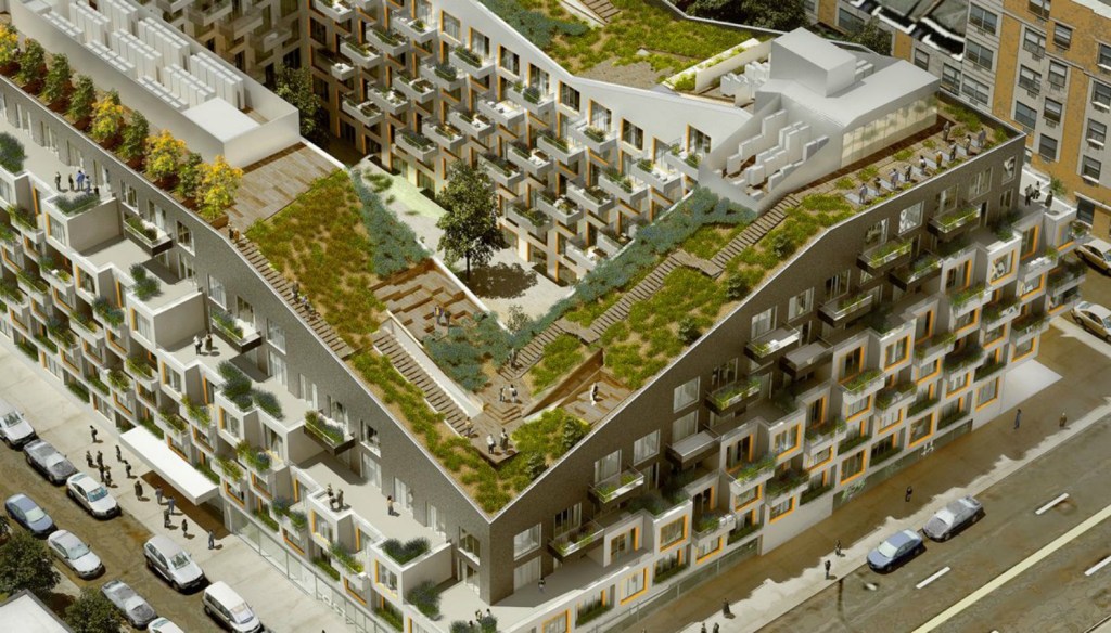 The courtyard space includes a fire pit, terraced area, an amphitheater, dog run, and park space. An additional 9,400 square-feet of interior recreational space built around the courtyard provides further amenities for residents, like a rock climbing wall, screening room, bike storage, cafe, day/evening lounges, library, gym, and study areas. The main event remains to be the roof however, with unique sloping angles that provide the upper four floors direct access to the green space, and more outdoor activities than what’s standard for an apartment building in the concrete jungle.