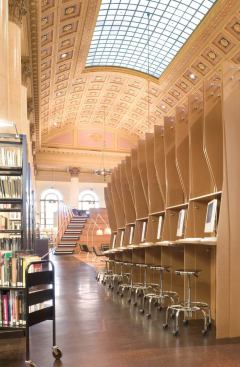For more than 10 years, the Rhode Island School of Design had scoured Providence looking for a place to expand its overcrowded library. So when the corporate gift of a Beaux Arts banking hall was offered, the college jumped at the opportunity. RISD already had converted the upper eight floors of the same 11-story office building into housing for 500 students. But the banking hall offer came with challenges—most notably, the library’s ambitious requirements for increased book and seating capacity. “Immediately we faced the question of how to increase the square footage,” says Ponce de Leon. “Where do we build a second level?”
