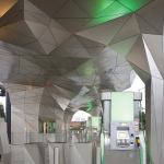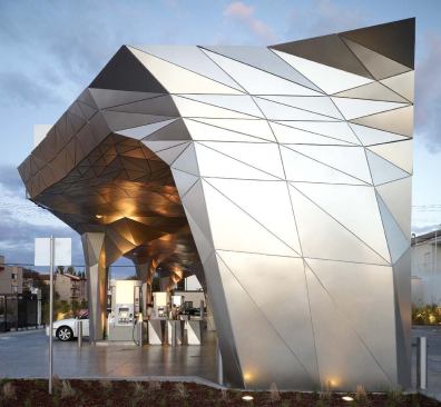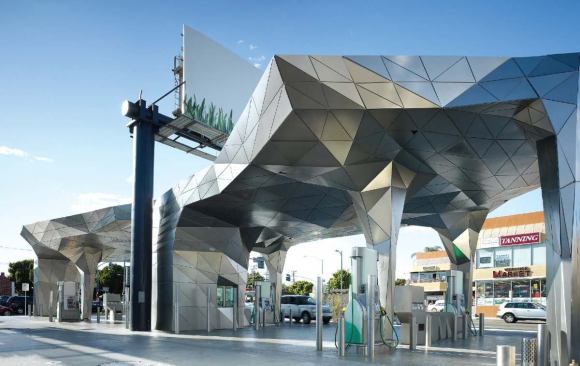 Two pre-existing billboards were leveraged to full advantage by Office dA to engage car-oriented Angelenos, but the station’s canopy is its most striking feature. With the structural bay as a starting point, a triangulated, stainless steel cladding system unifies the column base, shaft, capital, and canopy as a monolithic whole. The faceted, softly reflective surface also incorporates other functional aspects of the station, including the cashier kiosk and fin panels that function as signs.