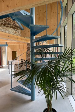 Move inside, and the confusion between new and old only increases. A slick concrete floor, a wood ceiling, and beams—supported at odd angles by baby blue–painted steel posts and I-beams—confront remnants of old brick walls, their openings left coverless and surmounted by wood beams screwed into some unseen structure with visible bolts. Take the spiral steel staircase upstairs, and you find yourself in wood cocoons that form the bedrooms, the dressing room, and the bathrooms where the occupants’ private lives unfold. Even there, part of the old peeks through: Shutters are cut to match the arched form of the existing windows, the brick pops up here and there, and from the bedrooms’ windows you can view the various structures of the building jumbling together in a mixture of brick, concrete, steel struts, wood, and tile. Rather than being a renovated building, this home is a collage of what was and what is, purposefully designed not as a fusion or a contrast, but an implosion of forms, textures, materials, colors, and periods in time that makes your eyes wander as you move through its rambling spaces.