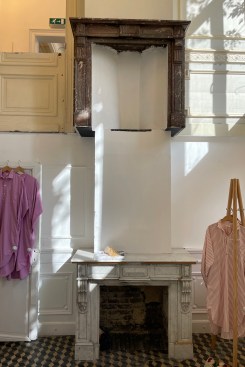 My favorite of the Taillieu buildings I saw on my brief, recent trip to Flanders was the renovation of a former mansion in the heart of the historical city of Ghent into a clothing boutique. From the outside, you would not notice anything had been done to this building beyond restoring its façade to its Neoclassical formality. Step in the front door of what is now Twiggy, though, and things fall apart all around you. Right next to the entrance area a cream-painted door, its original ornamentation picked out in a slightly darker hue, has been sawn in half to become a Dutch door. Peek through the open, top half and you find yourself staring into the void of what was once a salon. Taillieu removed the existing floor, leaving the marks of that operation clearly visible. The room’s fireplace now holds for dear life onto the wall in midair above its twin, which is firmly rooted on the lower floor.