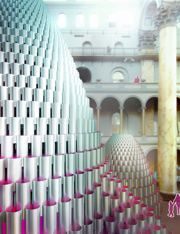 Originally constructed in the late 1800s to house the United States Pension Bureau, the National Building Museum in Washington, D.C., is deceptively hollow—most of the first floor contains a full-height Great Hall. (President Donald Trump has described the Great Hall as “a hell of a big room.”) For the last three summers, the museum has commissioned design firms to create a large-scale, interactive space-within-a-space, and today details dropped on Chicago firm Studio Gang‘s take for the Great Hall. Following Bjarke Ingels Group’s maze, Snarkitecture’s ball pit, and James Corner Field Operations’ underwater iceberg landscape, Studio Gang has designed “Hive,” a trio of “domed chambers” composed of over 2,700 wound paper tubes, for the museum’s 2017 Summer Block Party installation.