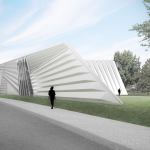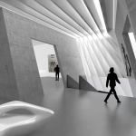 The new 46,000-square-foot art museum at Michigan State University is sited at the northern edge of the East Lansing, Mich., campus, with a plaza to the west and a sculpture garden to the east. “We approach architecture and landscape as interacting with each other,” says project architect Alberto Barba, noting that the landscape lines of the site determined the building’s form and the patches of pleated stainless steel fins that clad the structure. Although these fins create solid walls in some areas, in others they are installed over glazing and serve as sunshades to limit glare. Inside, three levels of open galleries and education spaces are oriented around a black metal stair and exposed concrete walls that define circulation paths. The linear pattern of the wood floors and recessed lighting reinforce the vocabulary of the pleats on the façade. “Both art and container are part of the same experience for the visitor,” Barba says. The museum will be completed in late Spring 2012.