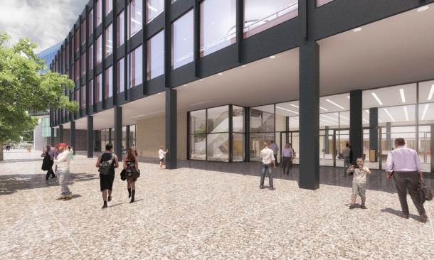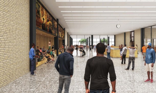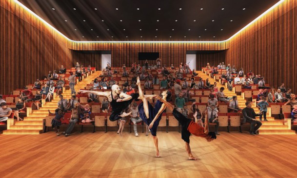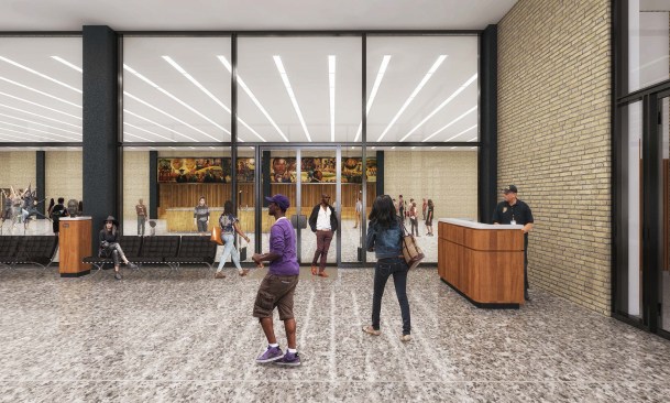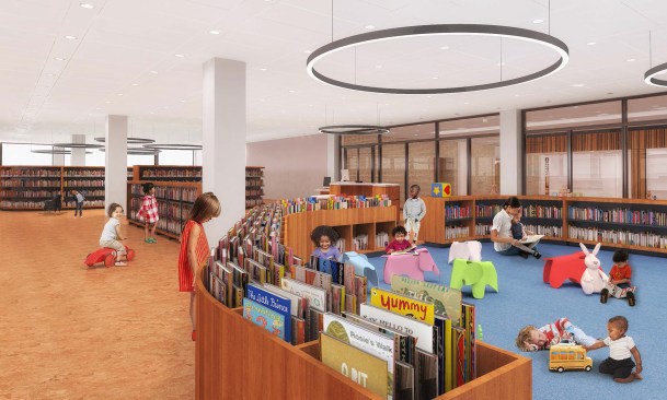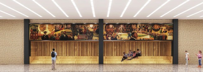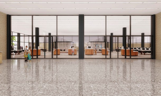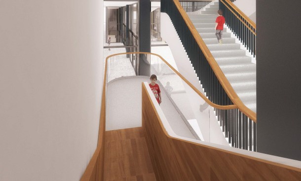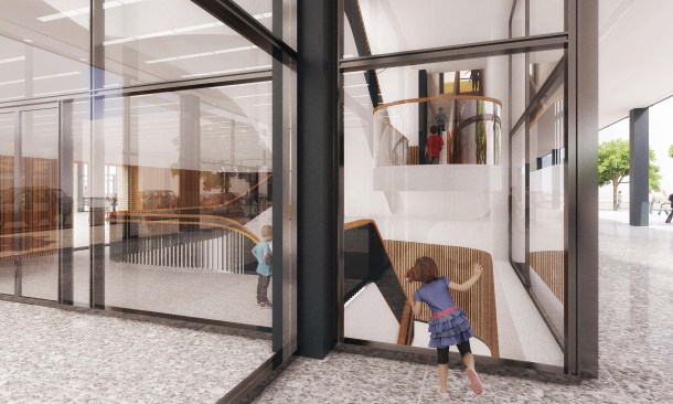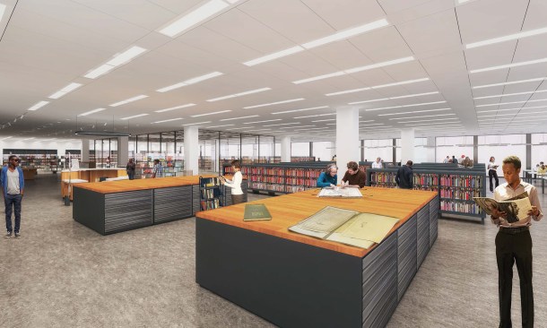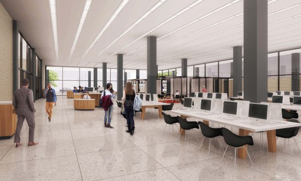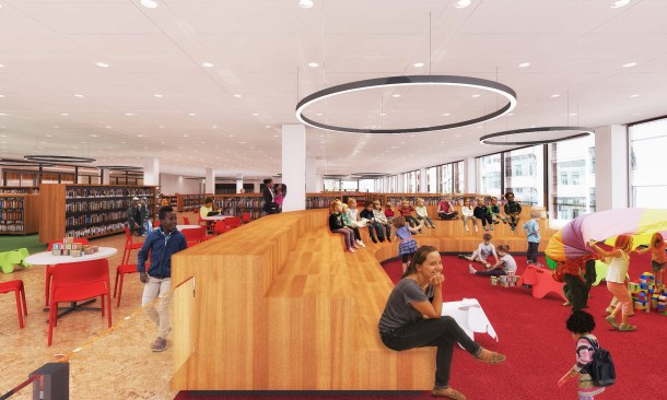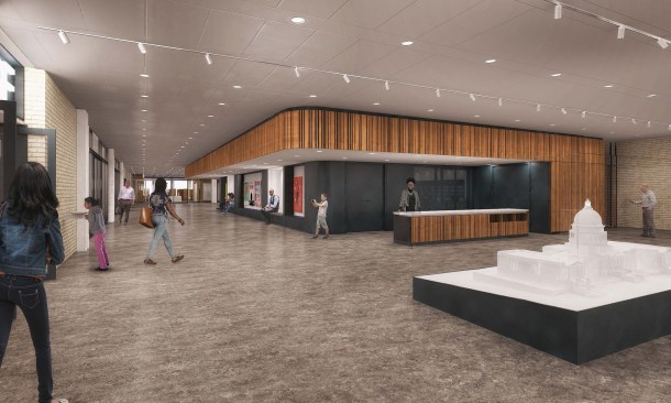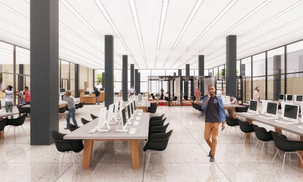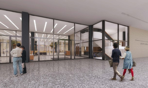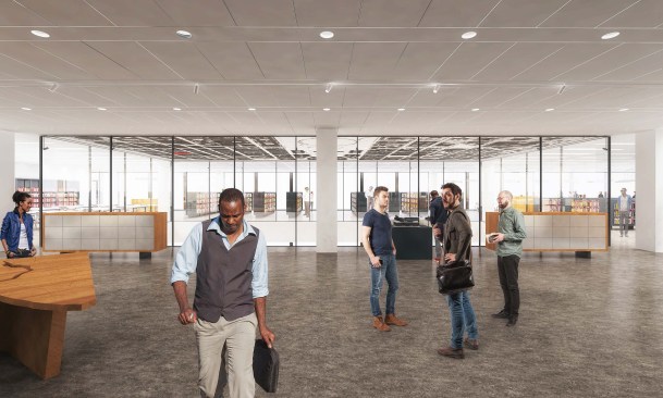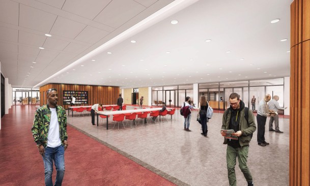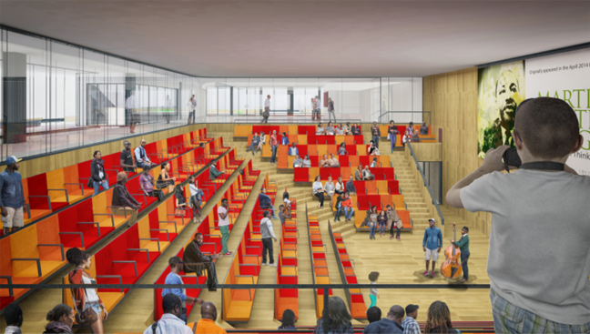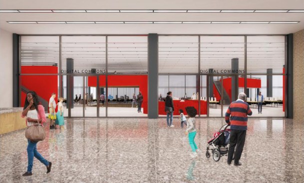 To those who have been following this project, these latest renderings will feel toned down to what has been released before. The “red elephants”—meeting room pods proposed for the ground-floor Digital Commons—are gone, replaced with visually quieter glassed-in meeting rooms. The first-floor performance space has also been eliminated, and scaled back to a kind of stepped seating bar along the north wall of the Great Hall.
