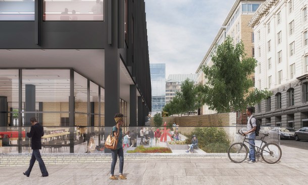 But many core elements remain. The auditorium, slated to sit on the fourth floor and continue through to the fifth floor, is in the same spot, but now features standard stadium seating instead of the U-shaped configuration that was presented earlier. The public roof space has also been reduced to roughly half of the overall roof area, and is now confined to the southeastern portion of the roof facing the National Portrait Gallery. The design for the double-height reading room on the third floor looks more developed, but basically the same. On the first floor, at the library entrance, the vestibule walls have been opened up along the south corners and replaced with glass, which would allow pedestrians walking past the library to see into the stairwell cores.