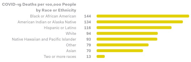 The pandemic has exposed significant disparities in health care and health outcomes, which are often driven by social determinants of health. We often use data to analyze a person’s social determinants and predict what level of health care service they will receive and what their outcome will be. Data from sources such as the COVID Tracking Project show that Black Americans are dying from COVID at 1.5 times the rate of white Americans [at the time of publication]. When a person has two “comorbidities,” or coexisting conditions such as obesity and heart disease, they are more vulnerable to COVID. Vaccines will help curb the pandemic, but they’re not going to resolve the underlying socioeconomic factors that are driving those disparities.
