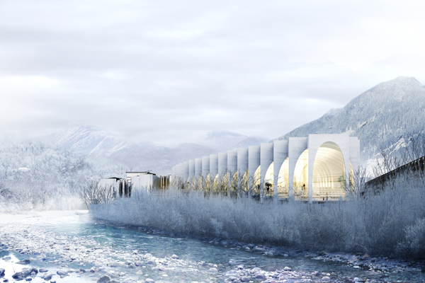 BIG’s take expands on a single feature from the original structure: the archway. BIG takes that form and expands on it. In the middle of the building, visitors will find the core of the site, a core sample of the Alpine riverbed will show the visitor the water’s 30-year journey through the mountains which purifies it.