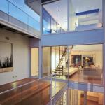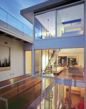 First-floor living spaces spill out into protected courtyards, and onto a glass patio that roofs the owner’s basement- level architecture studio.