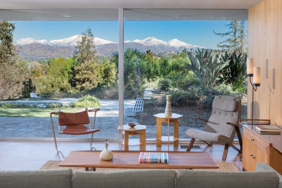 Although the home is only 22 miles outside of downtown Los Angeles, it is surrounded by eucalyptus trees and boasts views of the San Gabriel Mountains. The property features outdoor patio spaces and a private pool.