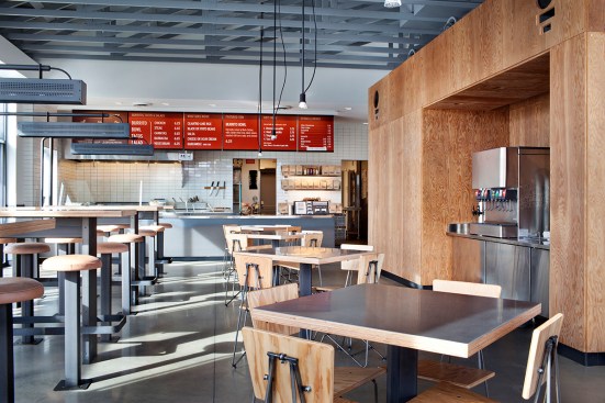 In the last few years, even the major fast food chains have redone their establishments to evoke anything from Prairie Style-extending forms (McDonald’s) to midcentury modern (Jack in the Box). Newer establishments such as Chipotle have taken the fast forms further into the realm of the Neo-Loft, exposing structure and using plywood and concrete floors to evoke a sense of urban chic.