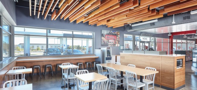 Now gas stations are getting into the act. A leader in that area has been the Des Moines, Iowa–based Kum & Go, whose new headquarters was designed by Renzo Piano, Hon. FAIA. Their latest stations, designed by BRR Architecture of Kansas City, Kan., are hipster heaven on the high plains. The ones we patronized on our trip had not only a gas pump apron that was simple (something that is fairly common these days), but their requisite convenience stores evoked lofts, with exposed metal rafters. Plywood-covered condiment stations and concrete floors, tables with tapering wooden legs, and wood slats on the ceiling to mark the eating area all sheltered in a standard box BBR broke up on the outside into cubes and horizontal planes. Supergraphics rather than pictograms showed you were you might find what you were looking for, with my favorite touch being the ampersand floating over the cashier station.