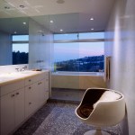 But the most recent tweak to Lautner’s modernist gem is the kitchen update. Because the kitchen is part of the main living space, though two steps above it, the architect wanted nothing to distract from the view, so upper cabinets were relegated to the pantry tucked behind the kitchen. Dark gray painted custom cabinetry in a simple Sixties style provides a perfect complement to the squared off, minimalist look of the Dacor appliances.