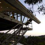 The house sits on V-shaped supports 60 feet above the canyon on Mulholland Drive. Its eye-shaped design features a curved roofline that swoops down at either end above walls of windows looking out over the city. The original house was designed for Russell Garcia and his wife Gina and was split into two halves—one half a space for entertaining, the other a private space with a study where Garcia, a musician, could work without being disturbed when his wife had friends over.