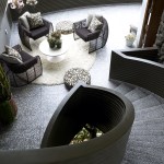 The Lautner-Garcia house is unusual, because even in modern architecture you don’t have to go outside to get to the other part of the house, as you do here, Radziner says. The curving central staircase serves as a main link between the public and private wings of the residence.