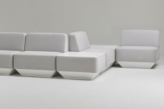 This minimalist, modular lounge system offers numerous configuration options. Its tapered base units can be used as tables, benches, or couches by adding multi-density foam backrests and hard veneer or acrylic tabletops. The units can be upholstered in a variety of the company’s fabric and leather options while the tabletops come in beech, maple, oak, and walnut veneer and white acrylic. davisfurniture.com