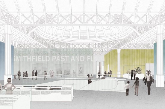 The West Smithfield site includes several Victorian structures, including the Smithfield General Market, the Fish Market, the Red House, and the Engine House. The General Market, the Fish Market, and the Red House have been threatened with demolition for almost 30 years, but the plans for apartment or office complexes have been stopped by campaigns against such destructive projects. Last December, the City of London gained control over the lease for these buildings and asked the Museum of London to consider relocating. The challenge of the competition is to tie the buildings together into a fluid space while maintaining the heritage of the Victorian structures, and also introduce 21st century technology and research centers within the budget of £130 million to £150 million (approximately $146 million to $168 million).