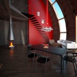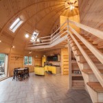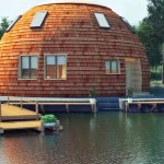 The two-story SkyDome, designed by a Russian company of the same name, is mostly made from wood and natural materials. The home’s façade is clad with solid pinewood. Shingles on the roof of the dome are made from larch, and the home is insulated with cork, flax, and seaweed.