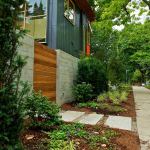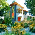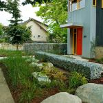 The lawn-free landscaping encompasses native plants and water-smart perennials, ornamental grasses, and permeable paving materials for driveways and walkways.
