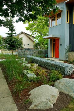 A gabion basket rock wall provides privacy in the busy urban neighborhood. It is softened by a variety of ornamental grasses.