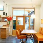 The dining area is adjacent to the kitchen and looks out onto the courtyard and laneway house beyond.