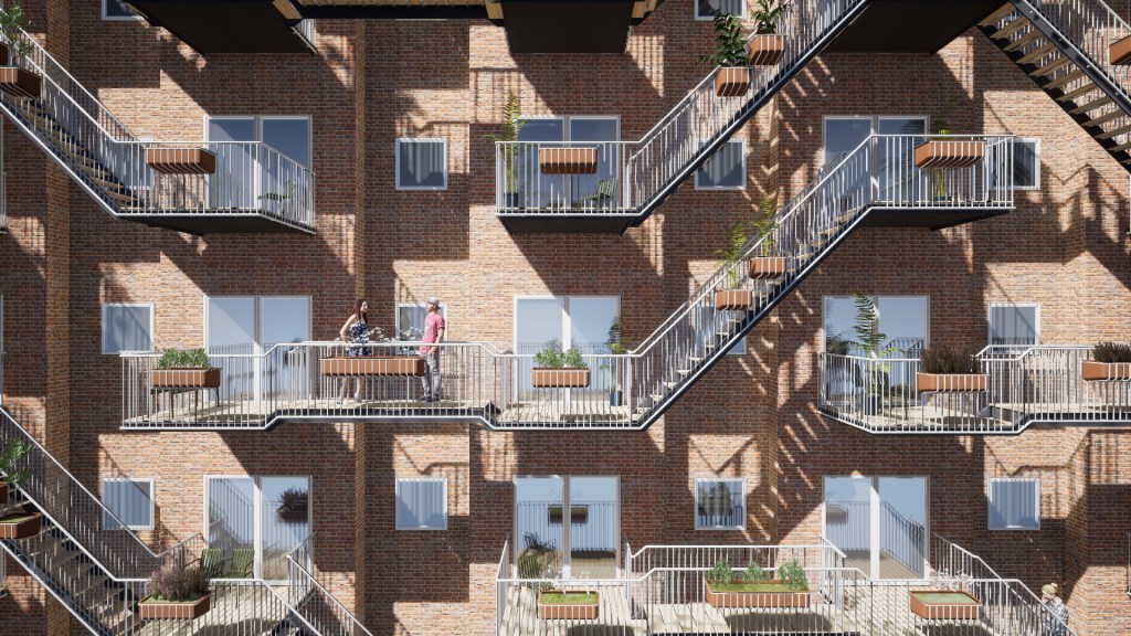 “While traveling, Van Capelleveen was inspired by apartments with communal gardens for people to relax, share a meal, or grow plants together,” says the Design Academy Eindhoven. “He realized that balconies, often used only for storage or hanging laundry, could be extended to create a practical, social solution.”