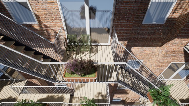 Called Social Balconies, the project, designed by product designer and recent Design Academy Eindhoven graduate Edwin Van Capelleveen, is a modular structure that connects apartment balconies together with bridges and stairs, creating a semi-public outdoor space. The system also comes with planters that can be attached to the railings of the staircases and bridges, which Van Capelleveen says make the building come alive and sparks interaction between residents.
