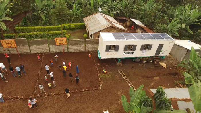 The solar-powered digital classrooms can travel self-sufficiently between rural African communities. The initiative’s first classroom is housed in a 40-foot shipping container outfitted with solar panels and a power management system designed for extended use.