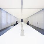 Consider the SoHo offices the firm designed for the New York production company Logan. The company mostly hires freelancers on a project basis, so the space is intended to be flexible, accommodating anywhere from a handful to dozens of workers at two 65-foot-long tables lined with computer work stations. The two tables are in rooms separated by a floor to ceiling scrim of white fabric. The same translucent fabric covers, but doesn’t totally obscure, the old cast iron building’s giant windows. The overall effect is ethereal, like the office is full of fog. It is more art than architecture, but it is also a well-thought-out, practical work environment.