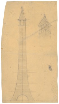 Six years after Loos had embarked on an extensive tour through the United States, where he was inspired by the modern buildings in New York and Chicago, he sketched this competition entry for a church along the Danube River in Vienna. The building, intended to honor of the 50th jubilee of the reign of Emperor Franz Joseph I, contains multiple allusions: to a lighthouse; to the city’s cathedral, the Stephansdom; and to the recently constructed Eiffel Tower. Loos, after realizing the conservative leanings of the judges, decided not to submit his design. Instead, Viktor Luntz’s proposal won out; his imposing Rhenish-Romanesque style church, dedicated to St. Francis of Assisi, stands today.