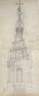Borromini designed this church, an exemplar of the Baroque style that was completed in 1660, for the University of Rome. In the Albertina’s drawing, the architect renders the spiral structure transparently, so the building’s interior features and supports can be seen behind the tapering parapet walls on the exterior. Today, the project is one of a handful of buildings designed by Borromini that dot the Roman skyline and streetscape, including the Oratorio dei Filippini, the Collegio di Propaganda Fide, the Palazzo Pamphilj, and Sant’Agnese in Agone.