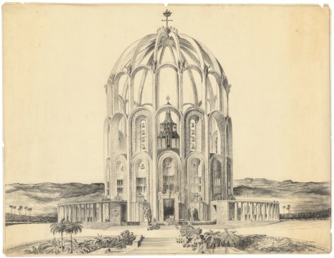 In 1939, Holzmeister, an Austrian architect who had been recently exiled to Turkey after the Nazi occupation of Vienna, accepted an invitation to travel to Rio de Janeiro and design a number of buildings. Among them was this monumental church, never realized, that was intended to accommodate 14,000 parishioners. Drawing on his fascination with the Hagia Sophia, Holzmeister designed a circular structure that gave worshipers unrestricted views of the altar, which was dramatically topped by a crown of reinforced concrete that rose 150 meters into the air.