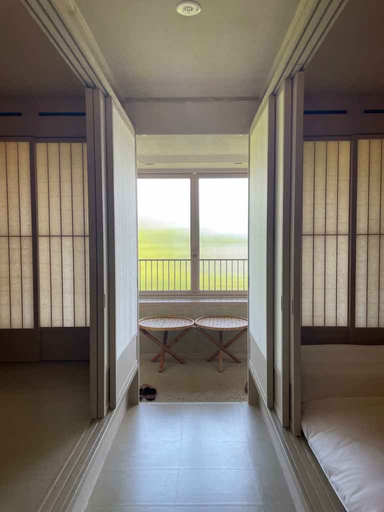 The rooms are cocoons with accoutrements such as all-gray paintings and a lack of technological implements. Between the frosted glass and the sliding screens, which even divide different beds from each other in the doubles, you feel forced to turn in on yourself.