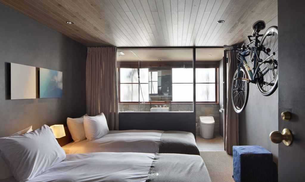 Setouchi and Onomichi have been promoting their city, which sprawls across several adjacent islands connected by bridges, as a site for touring on two wheels, and U2, designed by the Hiroshima-based firm Suppose Design Office, houses a bike store and repair shop along with various other purveyors of food and gift objects in the halls around the rooms. Inside those, the tiny spaces are intended just to sleep while your bike hangs from hooks on the wall. U2 is as minimalist and cocooning as LOG, but here you are surrounded by dead tech rather than abstracted apartment elements.