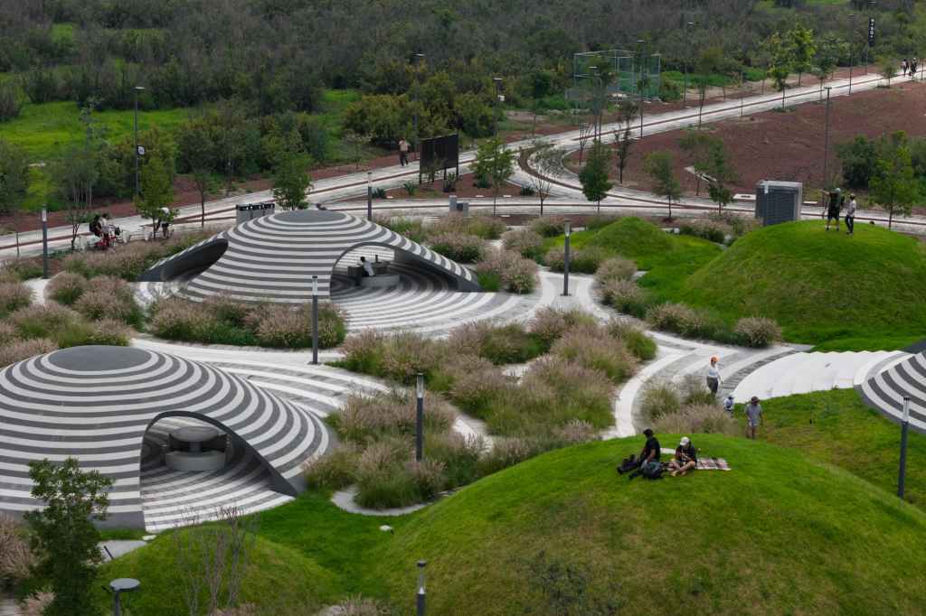 At the other edge of the site from the caracol Echeverria has echoed its shape with half a dozen circular terrains that are mainly the location of the sports fields and support structures. The shape was the most efficient manner to stabilize the soil there but it also, as the architect admits, gives the new Park its most visible shapes, especially seen from aerial photographs or from airplanes flying in and out of the existing airport. Here you will find more fragments, but in this case intentional ones. They include mastabas, hollowed out on one side, that serve as the site for both jai alai and revived pre-Columbian games; a stadium setting for newly popular American football; a concrete strip that will house shops; running and bicycling tracks; and a collection of sewer culverts saved from the airport construction that now serve as sculptural planters.