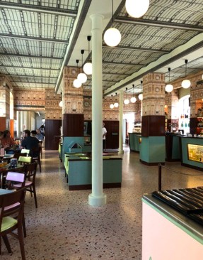 The space that best sums up all these faints and illusions, however, is one Koolhaas and his team did not design: the café, a stage set created by film director Wes Anderson. Recalling a traditional Milanese establishment, it makes the act of recall evident by painting on the metal ceiling and using traditional furniture and fixtures. But Anderson then adds a knowing reference by using colors for the counters in the same color Prada uses in its store interiors. Both a display place for Prada and an evocation of another time and space, the whole Prada Foundation makes you feel like an actor in a nostalgic movie and in the company’s aesthetic universe as soon as you cock your head to consider a painting or sit down to order an espresso.