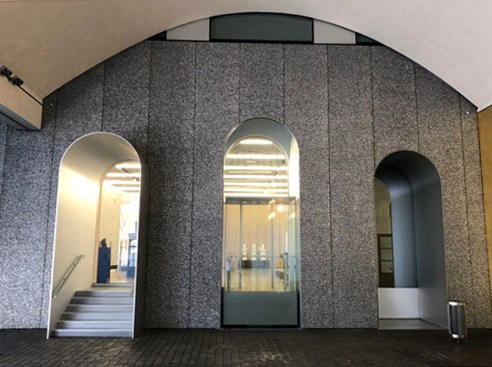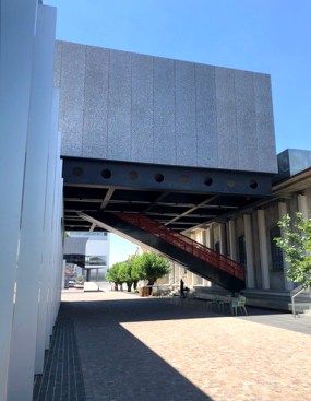 There are moments of expression and rhetoric in this complex. One of the new boxes cantilevers over a courtyard, exposing a belly of steel girders and spouting an escape stair. Another building is clad all over in reflective glass, playing the by now classic modern game of asserting its presence while pretending to just mirror its surroundings. Inside, translucent walls made of polycarbonate slide by concrete structures, attached with diagonal bracing, while stairs descend under skylights to tombs where art treasures lie buried—one of these is the cave that photographer Thomas Demand created for Grotto, which is a reproduction, in cardboard, of a grotto on the Spanish island of Mallorca and the set he used to produce a series of photographs of that name.
