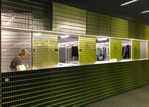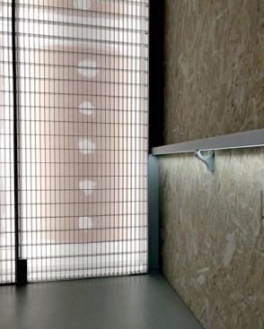 The Prada Foundation is a collage not only of old and new construction, but also of different materials. OMA seems to have chosen most of these for their ordinariness: plain concrete and unfinished plywood, which have become the signature of a certain kind of late Modernism, as well as metal fencing and lattices, sheets of laminated plastic, and panels of cast concrete aggregate. If these neutral and banal surfaces produce any reference, it is to Milan’s post-1960s modernist vernacular. Areas such as the coatroom even recall the city’s subway system, all green gloss and fluorescent light. Koolhaas and Miuccia Prada—chief designer for Prada and the granddaughter of founder Mario Prada, she’s the one who collected the art that is housed here—have a distinct fondness for the forms and colors of the era in which they were teenagers and young adults. What the Foundation then does is turn what is a mainstay of Prada’s fashion into its architectural equivalent.