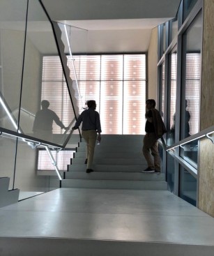 What all these gestures—both small and large—or faints from the ordinary have in common is that they give you the sense that you have wound up on a stage set. Objects, whether art or architecture, and you are posed against these shifting planes that seem at times to construct a fragment of a modernist utopia from the past, when we thought all buildings would be made of human-made materials and would soar over our heads. But the illusion is never complete. At times, Koolhaas makes you feel as if you are behind the scenes, looking at how the effect is created. The staircase in the new tower is a double scissor, only one side of which you use (the other is the fire escape), while windows show you the other, inaccessible, run. The walls here are covered in particleboard, while at the landings you look through a metal screen at an unfinished wall, complete with all the painting marks on the drywall, lit like a work of art.
