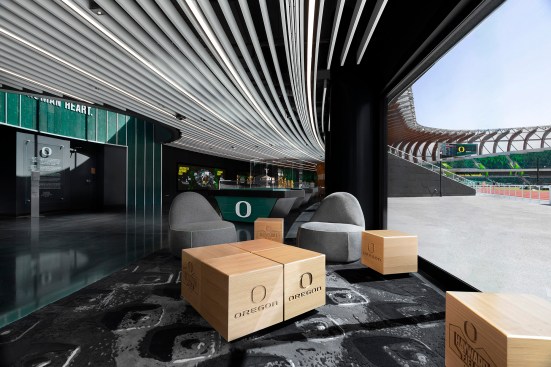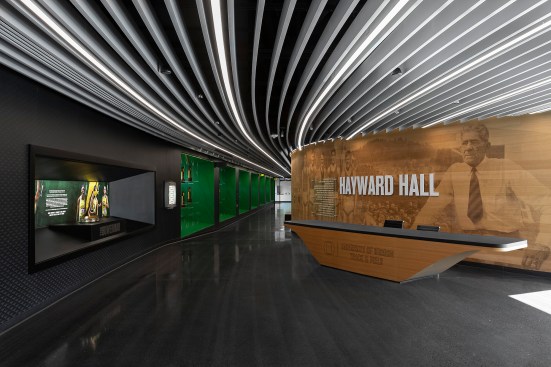Welcome to Hayward Hall, a new 4,000 square-foot museum under the east end of University of Oregon’s Hayward Field, the hallowed shrine of American track and field. The new exhibition hall is part of a $270 million top-to-bottom renovation of the entire athletic facility. The reimagined stadium is now a state-of-the-art facility specifically designed for viewing and celebrating Oregon’s athletics and, in particular, its track and field legacy.
