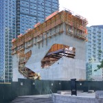 - The wall structure was fashioned by 12-foot-by-10-foot formed-in-place concrete panels using common OSB as the form liner, tied together by dense steel rebar. A scaffolding system followed the panel sequence up the 82-foot-tall structure in a series of lifts.