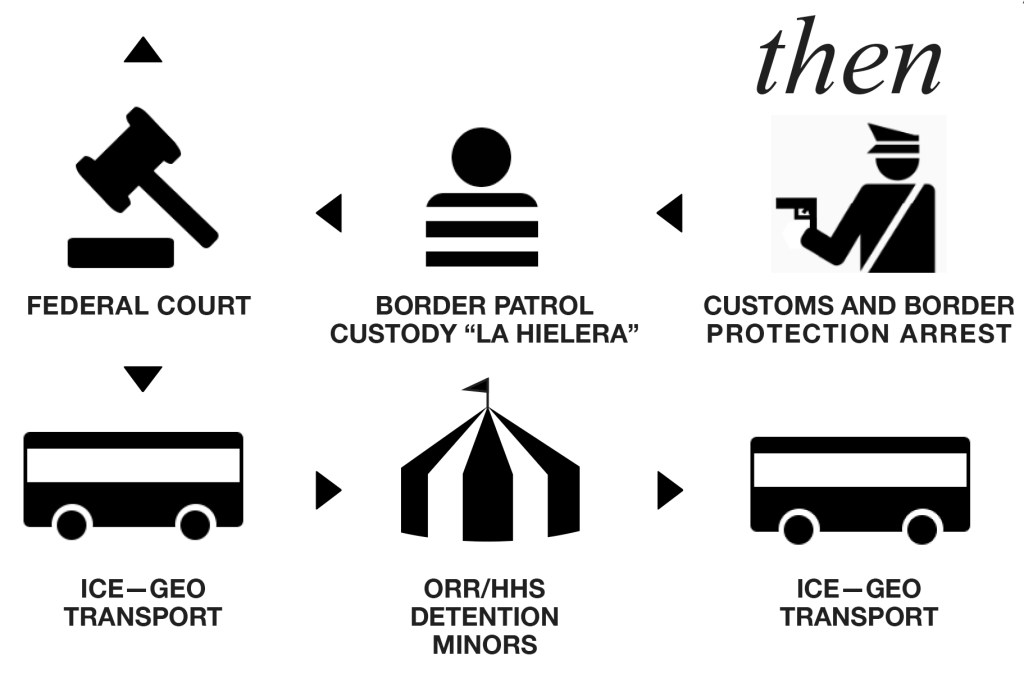 Carroll points out that there are a number of organizations (such as the Refugee and Immigrant Center for Education and Legal Services, the Women’s Refugee Commission, and the Innovation Law Lab) that are working to ensure that everyone who applies for asylum has legal representation, has a way to understand which bus they need to take and where, can manage their ankle monitors and background checks, and can be prepared for an immigration hearing—hearings which often happen in an entirely different state than the one an asylum seeker has entered. Carroll’s one explicit ambition is that a diagram of this process can lead to greater cultural understanding of the various economic and psychological costs of how asylum seekers are currently treated—for instance, “the humanity of having an ankle monitor versus someone being incarcerated.” Incarceration costs the government $700 per day and causes untold psychological damage to those incarcerated. An ankle monitor costs $15. And yet, the government has incarcerated thousands of people at the border.